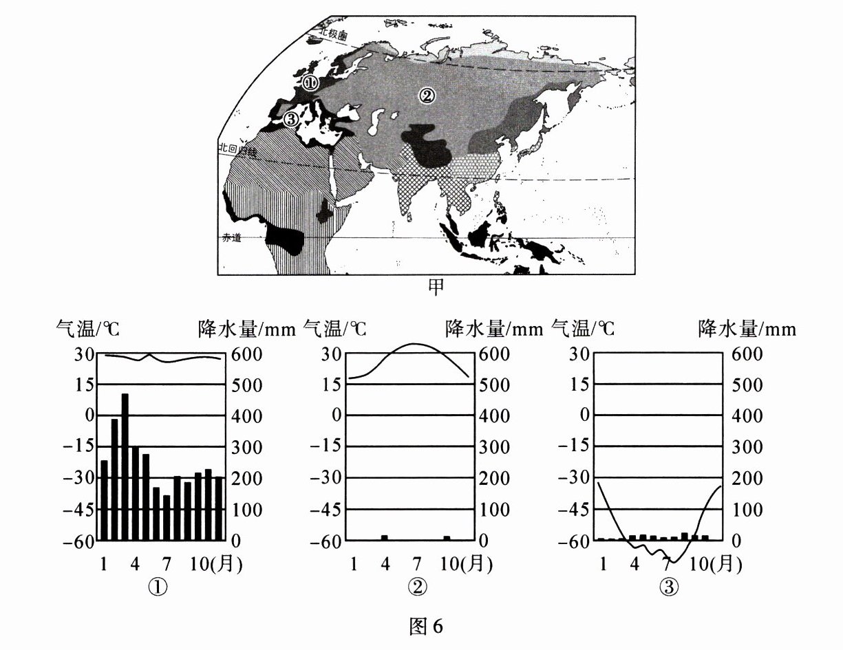 (1) 将图甲中①②③三地所属的气候类型与图乙中字母所示的气候资料进行搭配(填字母):①— ;②— ;③— 。