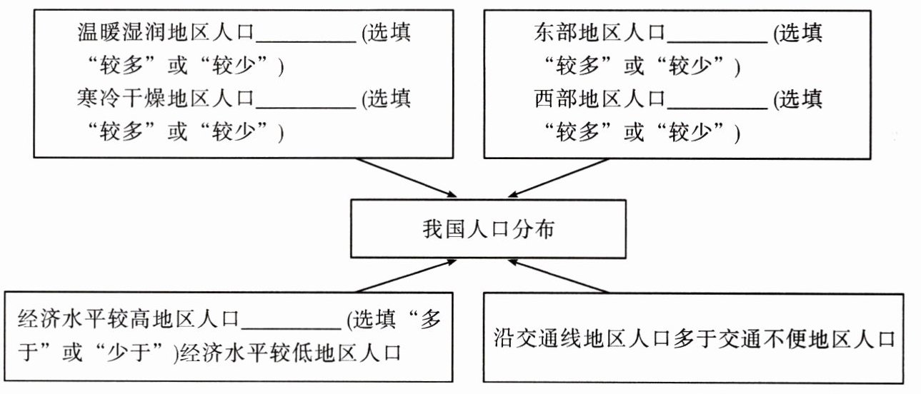 (3)请完成下面结构图,认识我国人口分布特点形成的原因。