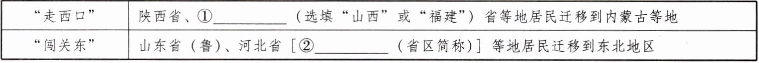“走西口” 陕西省、①______(选填“山西”或“福建”)省等地居民迁移到内蒙古等地