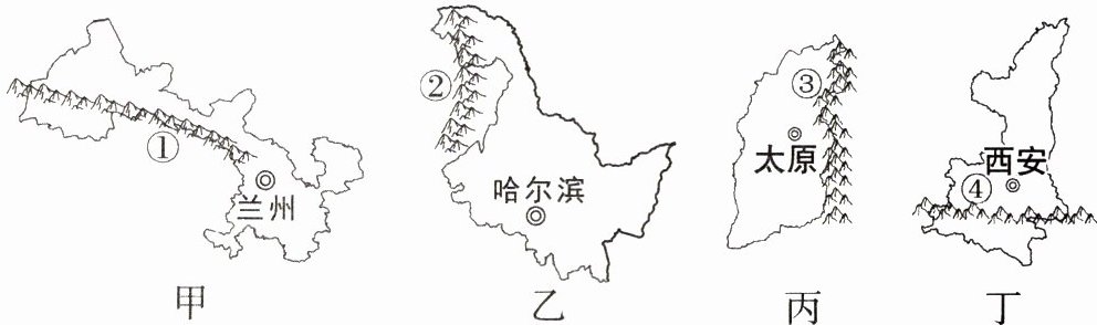 思路点拨:由图可知,甲省为甘肃省,乙省为黑龙江省,丙省为山西省,丁省为陕西省。再结合地图,找出四省附近的山脉依次为祁连山脉、大兴安岭、太行山脉、秦岭。
