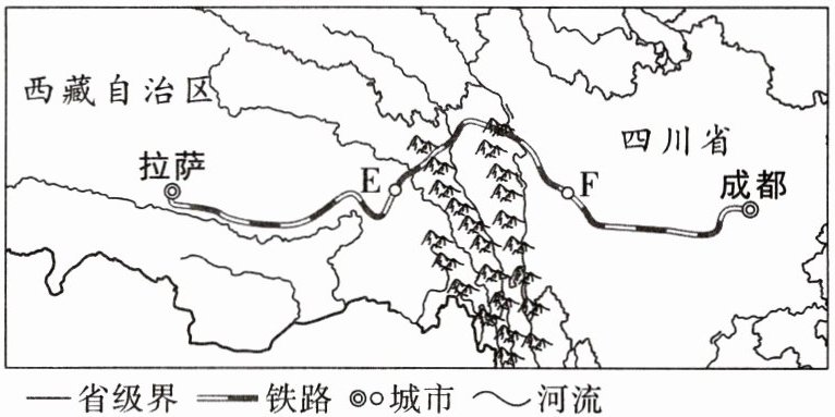 川藏铁路连接了成都和拉萨,是我国修建的又一条入藏大动脉。读在建川藏铁路线示意图,完成3~5题。