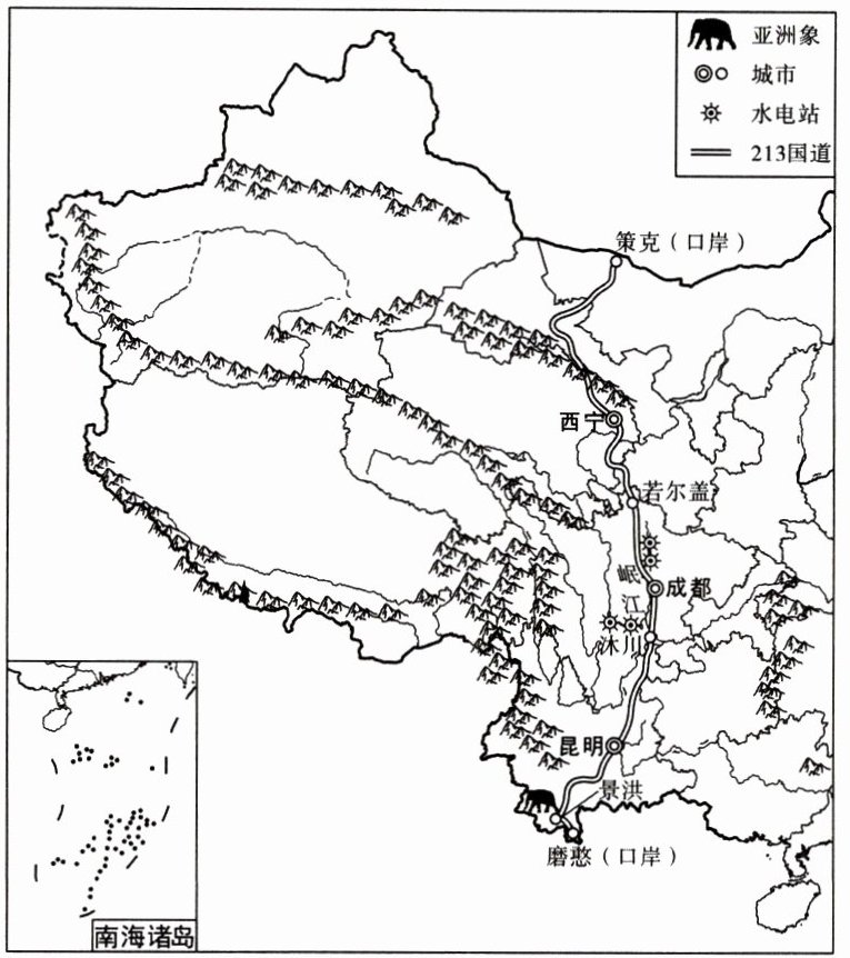 (1) 213国道大致呈______走向,途经我国地势第______级阶梯,依次经过了内蒙古、______、青、______、云五个省级行政区(省区简称)。