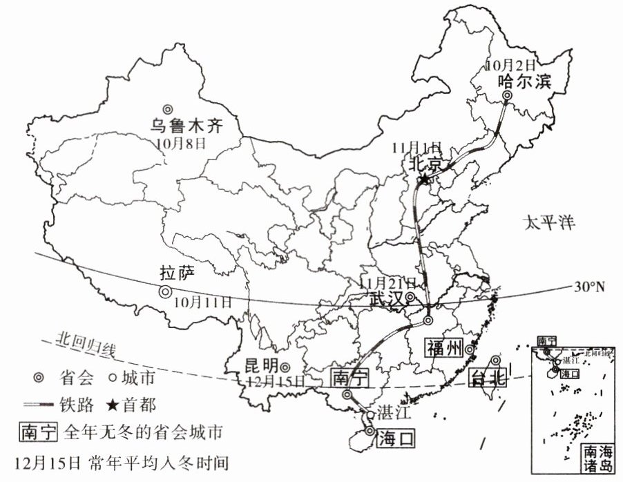 7. 下图是我国部分城市常年平均入冬时间分布图。阅读图文材料,回答下列问题。