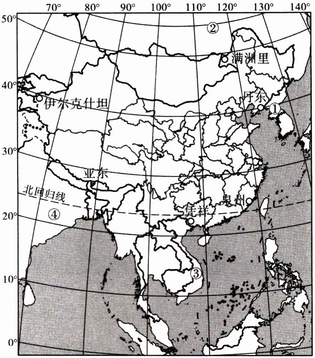 (2)满洲里是图示最北口岸,位于中国与②______(国家)、蒙古交界处;凭祥是我国南部口岸,位于中国与③______(国家)交界处。