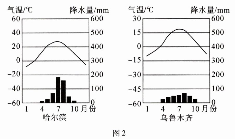 7. 明代李时珍编撰的《本草纲目》记载了上千种中草药。最初中国人把用来治病的植物称为本草,现在某些本草已经是举世公认的中国符号。图1示意我国气候类型和四种本草分布,图2示意哈尔滨和乌鲁木齐的气候资料。读图回答下列问题。