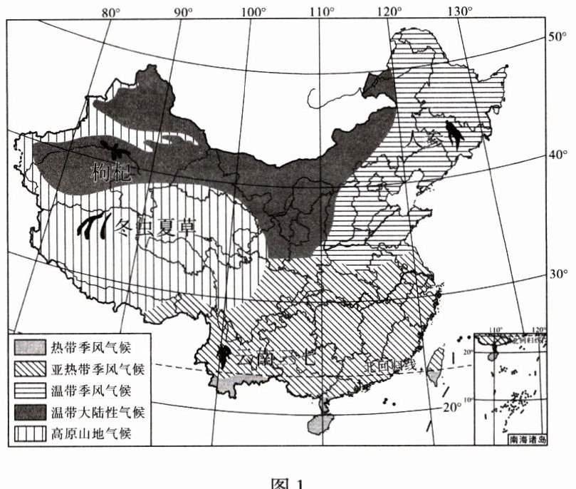 (3) 冬虫夏草生长在海拔3000米以上的雪山草原,适宜其生长的气候类型是______。枸杞的生长习性是喜光、耐寒、耐旱,新疆有利于枸杞生长的气候条件是______(列举两个)。