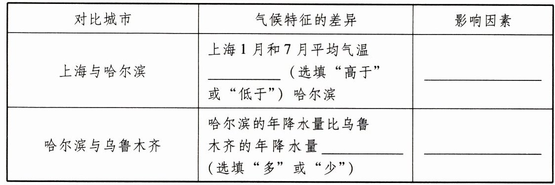| 哈尔滨与乌鲁木齐 | 哈尔滨的年降水量比乌鲁木齐的年降水量______(选填“多”或“少”) | |