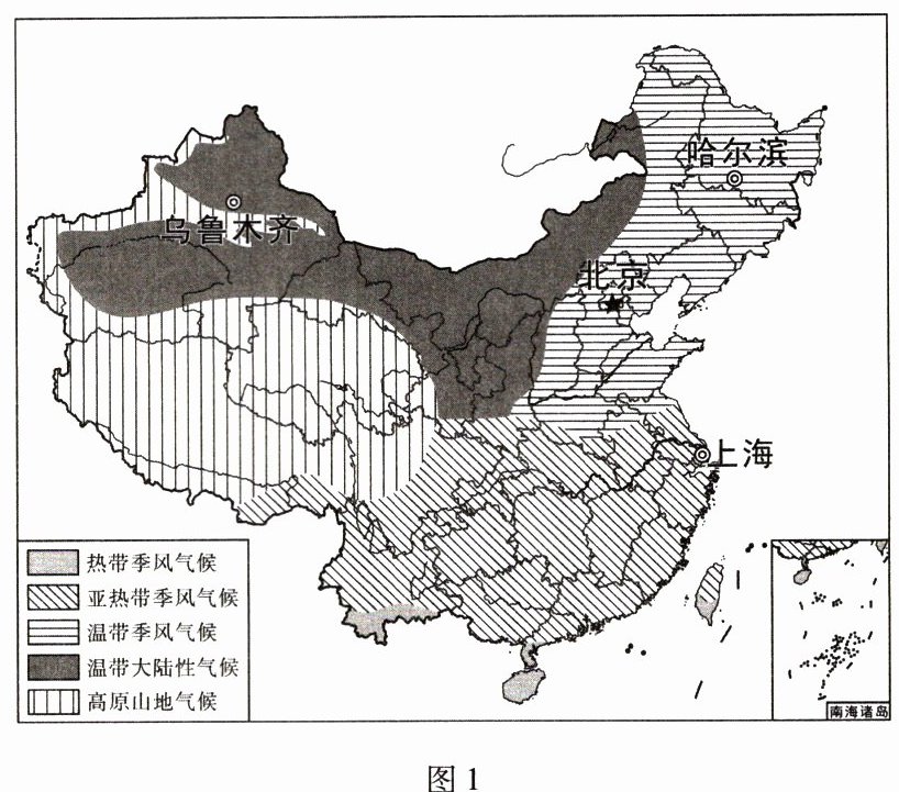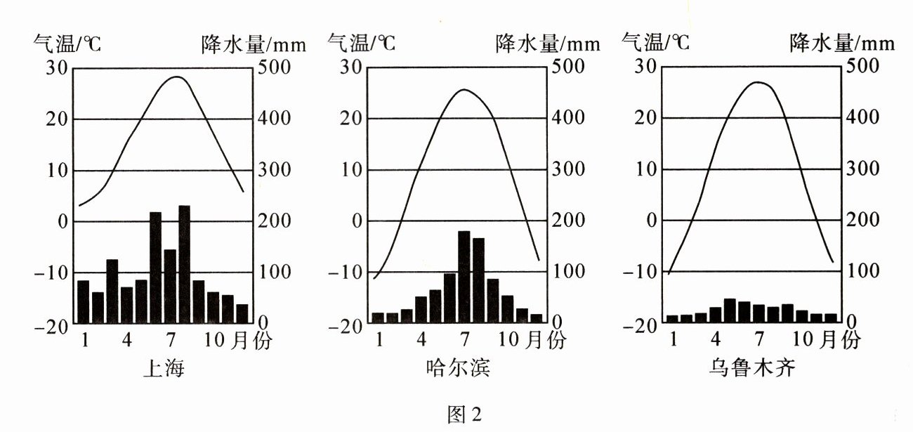 6. 地图是地理学习的工具,同学们利用多种地图学习气候的相关内容。图 1 为中国气候类型分布图,图 2 为部分城市气温曲线和降水量柱状图。读图回答下列问题。