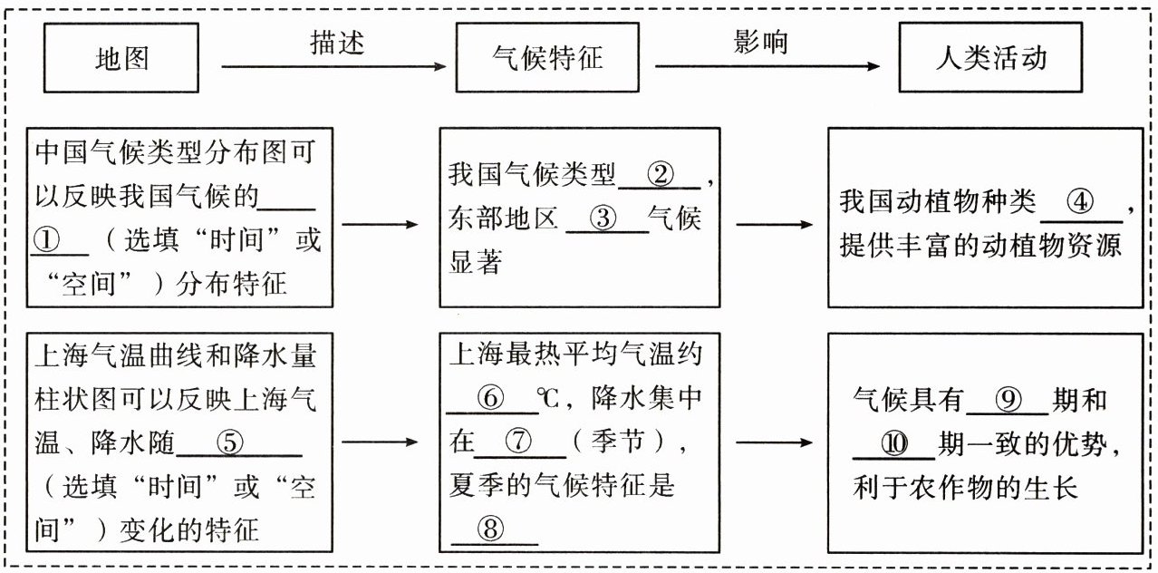 G[上海气温曲线和降水量柱状图可以反映上海气温、降水随__⑤__(选填“时间”或“空间”)变化的特征] --> C