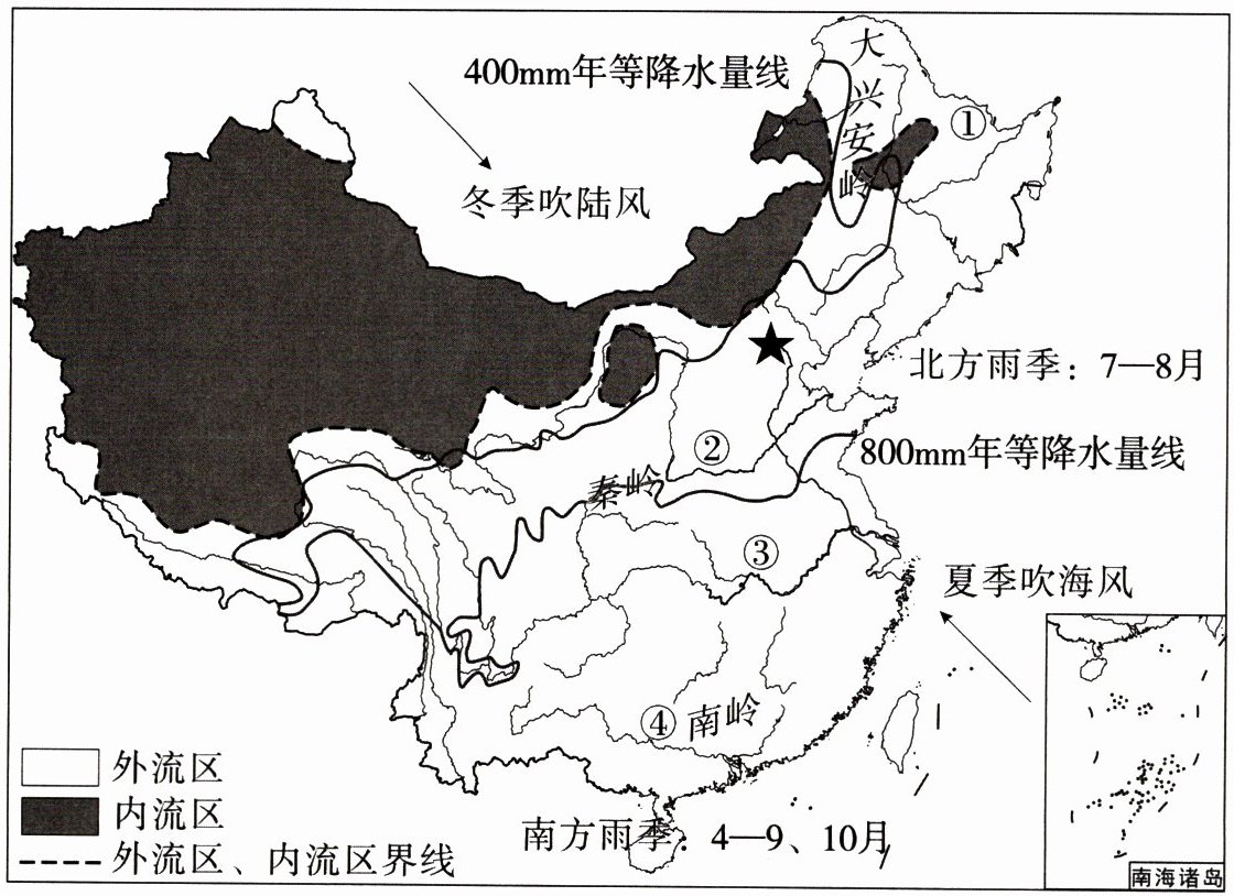 (1) 读图可知,我国内流区与外流区的分界线与____mm 年等降水量线最为接近,由此可以推断,我国外流区的主要水源是____。图中①②③④四条河流中,汛期最长的是____ (填序号)。