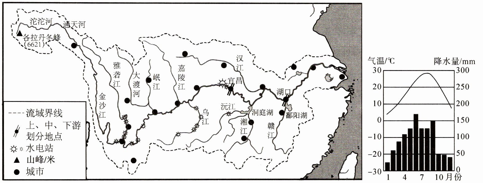 6. “绿水青山就是金山银山。”长江经济带发展必须从中华民族长远利益考虑,走生态优先、绿色发展之路。读长江流域图和鄱阳湖气候资料图,回答下列问题。