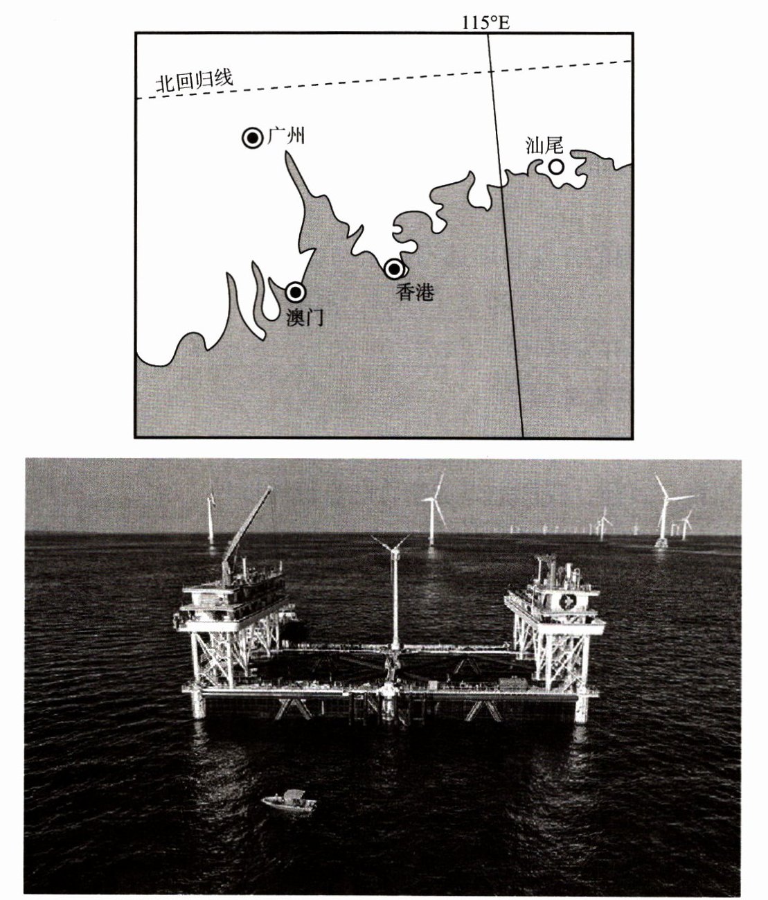例:2024年9月4日,全国首个超大型风渔融合网箱平台——“伏羲一号”在广东省汕尾市(如图)正式投产。它采用桩基桁架式结构,集风力发电、海洋养殖于一体,水上发电、水下养鱼,实现了绿色电力、蓝色粮仓。下图示意汕尾市位置及“伏羲一号”景观。据此完成下面小题。