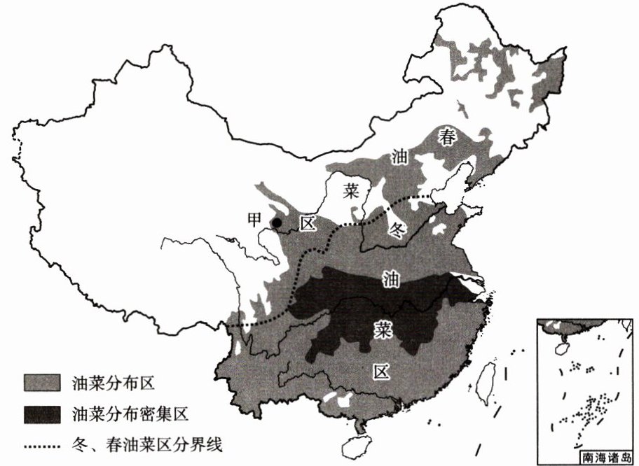 油菜花已成为神州大地上一道亮丽的风景线。油菜花盛开时节,摄影爱好者会踏上追寻油菜花开的旅程。下图示意我国冬、春油菜主要分布区。据此完成4~5题。