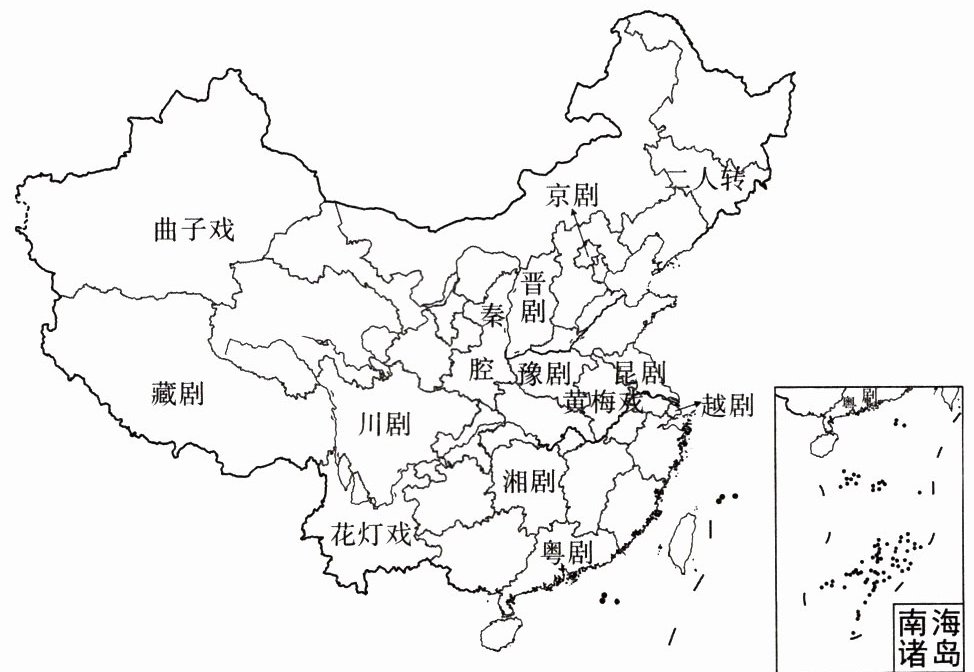中国戏曲源远流长,种类繁多,百花齐放。下图示意我国部分地方戏曲分布。据此完成 1~3 题。