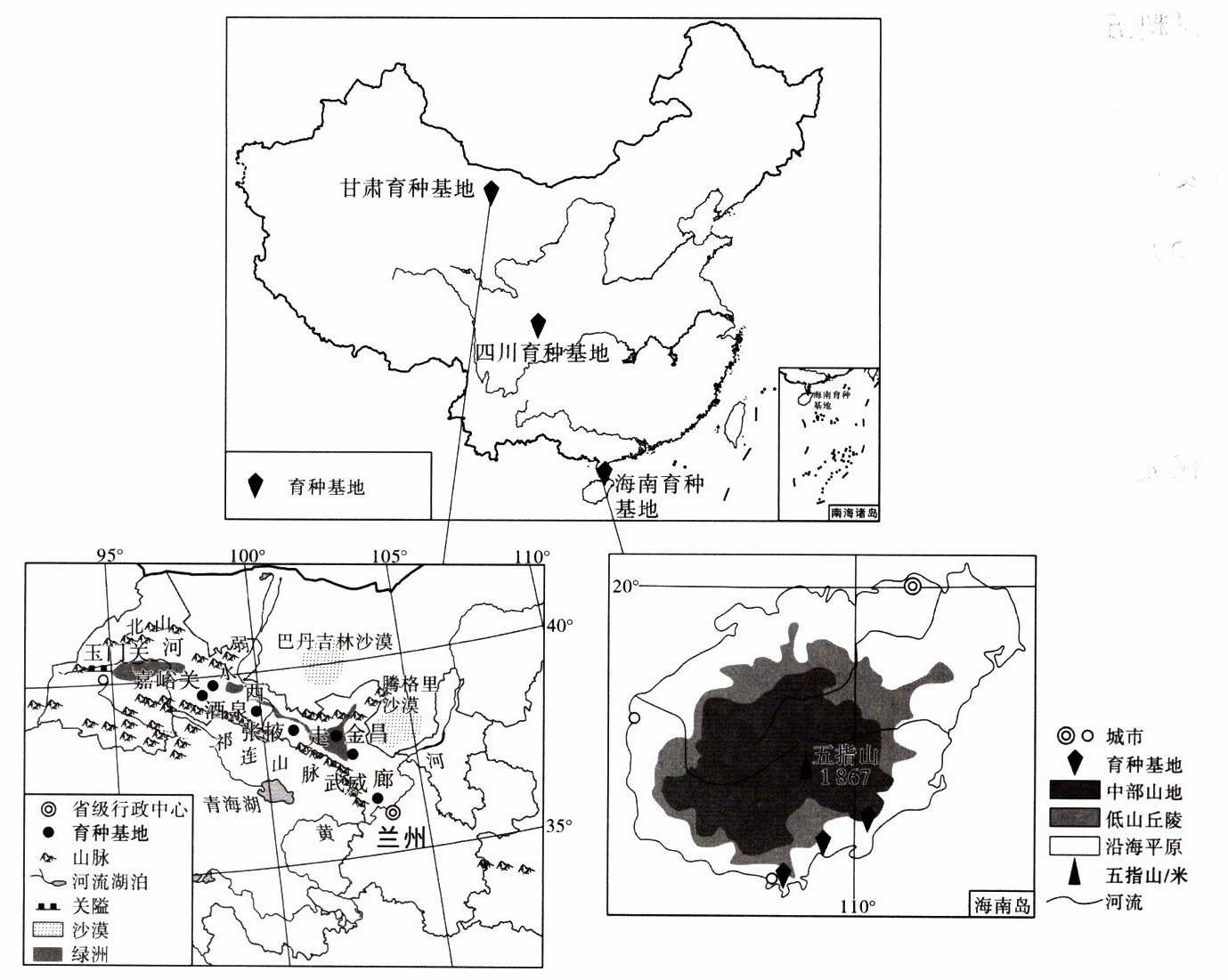 材料三 下图分别为我国三大育种基地分布图、河西走廊育种基地分布图、海南岛地形及育种基地分布图。