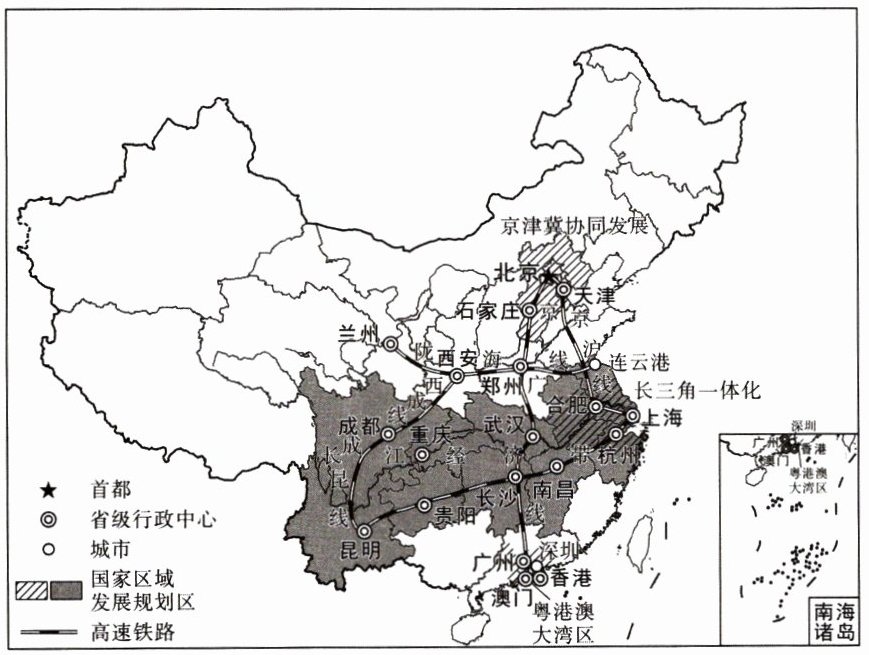(2024·山东滨州) 我国提出“深入实施区域重大战略”,提升区域引领带动能力,推动区域重大战略取得突破性进展,促进区域间融合互动、融通补充。读新时期我国区域发展战略示意图,完成1~3题。