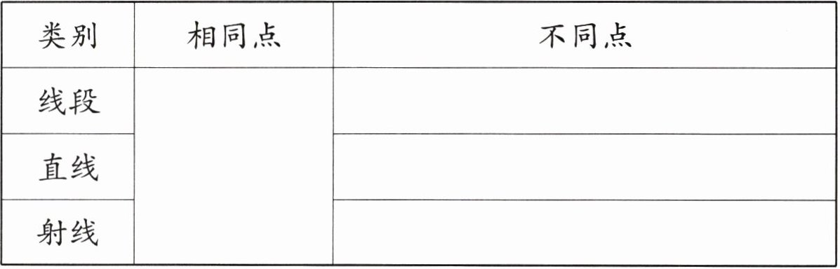 相同点:都是直的 不同点:两个端点,可以量长度 没有端点,无限长 1 个端点,无限长