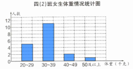 (3) 从四(2)班女生体重情况统计图中可以看出: 体重在( )范围的女生人数最多,是( )人;体重在( )范围的女生人数最少,是( )人;最多与最少范围的人数相差( )人;本次一共调查了( )名女生。