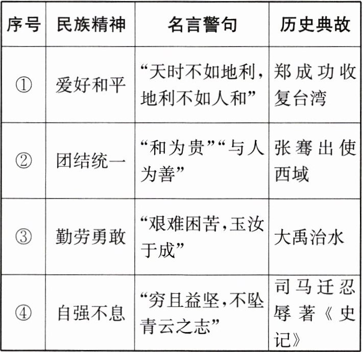 7. 下列表格中,中华民族精神与名言警句及历史典故相一致的是( )