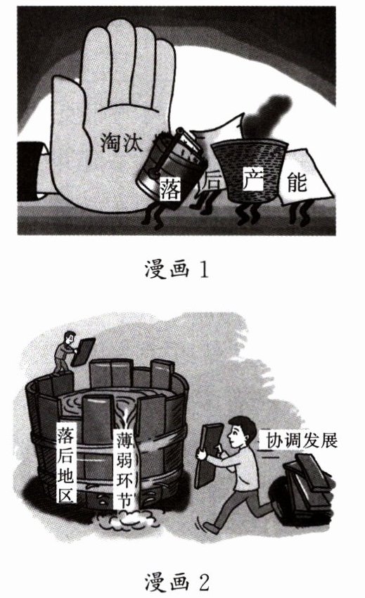(1)漫画1说明我国还存在能源结构落后、粗放式增长的问题;漫画2说明我国当前区域发展不平衡、不协调。(2)转变发展方式,优化经济结构,转换增长动力,建设现代化经济体系;促进区域协调发展,坚持中国特色新型城镇化道路,坚持城乡融合发展,促进社会公平正义。