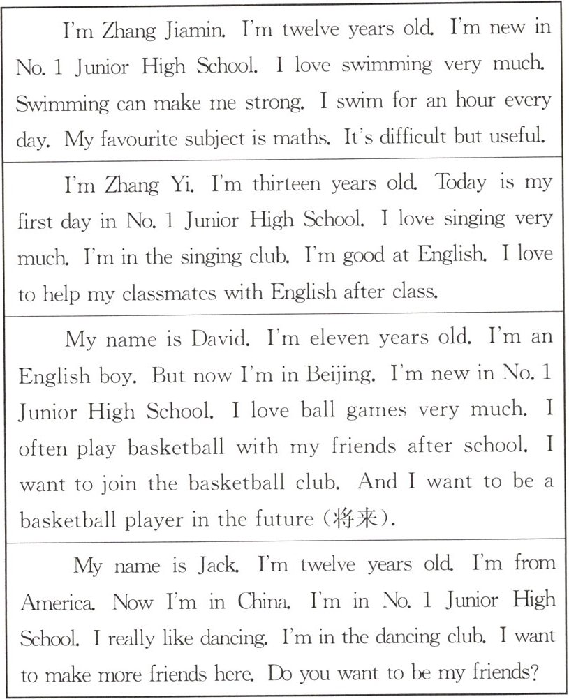 | I'm Zhang Jiamin. I'm twelve years old. I'm new in No. 1 Junior High School. I love swimming very much. Swimming can make me strong. I swim for an hour every day. My favourite subject is maths. It's difficult but useful. |