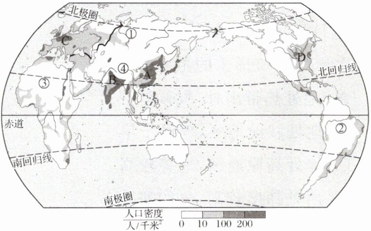 (1)人口稠密区:亚洲的A______和B______、C____洲西部及D______东部。A、B两个地区______优越,______较早,养育了众多的人口。C地区______较早,______,人口稠密。