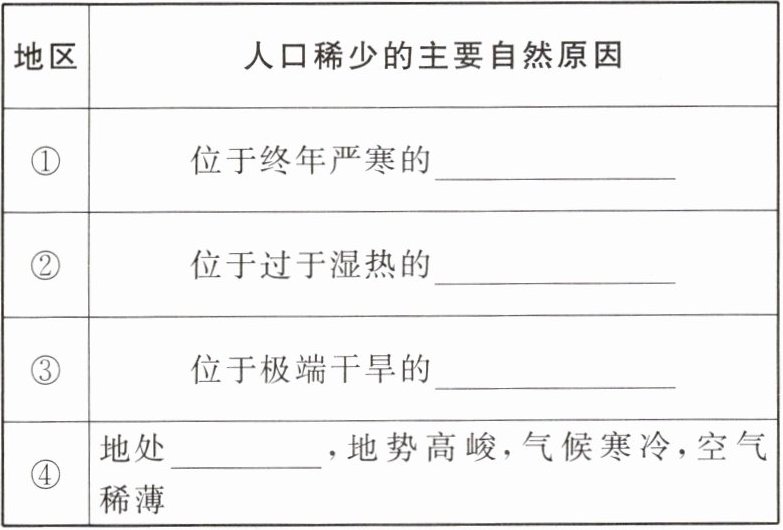 1. 人口密度:表示人口的______,是指平均每平方千米内居住的人口数。
