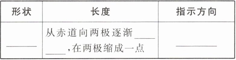 |______|从赤道向两极逐渐______,在两极缩成一点|______|