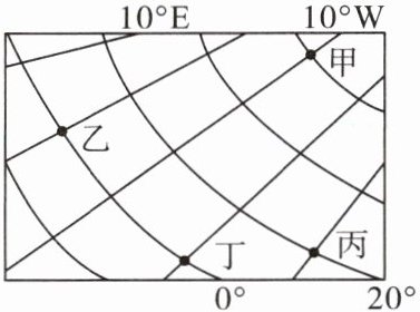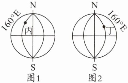 B 解析 图 1 是西半球,图 2 是东半球;本初子午线(0°经线)位于东半球;图中相邻两条经线的经度差是 45°,丙点的经度是 155°W;丁点的经度是 115°E。