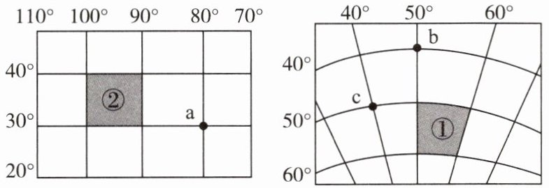 10.A 11.B 解析 第 10 题,c 点的经纬度是(50°S,40°E),可以判定 c 点的半球位置是南半球、东半球。第 11 题,读图可知,①②两区域所跨纬度都是 10°,所跨经度也都是 10°,但是①在 50°S 到 60°S 之间,②在 30°N 到 40°N 之间,在①②两区域中,②的纬度更低,实际面积比①大。