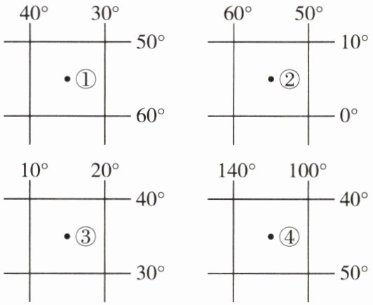 C 解析 读图可知,①点的经纬度约为(55°S,35°W),②点的经纬度约为(5°N,55°W),③点的经纬度约为(35°N,15°E),④点的经纬度约为(45°S,120°W)。在网格状经纬网图中,纬线指示东西方向,经线指示南北方向,因此①在②的东南方向,②在③的西南方向,③在④的东北方向,④在①的西北方向。