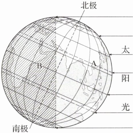 (1) 用彩笔沿地球表面将昼夜半球分界线描出(连接图中的南北极,经过图中B点附近的线);该线为晨线。