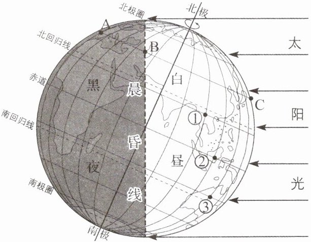(3)图中左侧阴影部分被称为____(填“夜”或“昼”)半球。B地所在虚线是____(填“晨线”或“昏线”)。