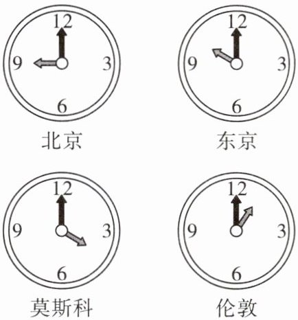 (地理实践·生活常识)小杰利用暑假开始了北京之行。入住宾馆时,他发现大堂墙面上四个城市的钟表时间不一样。结合下图,完成4~5题。