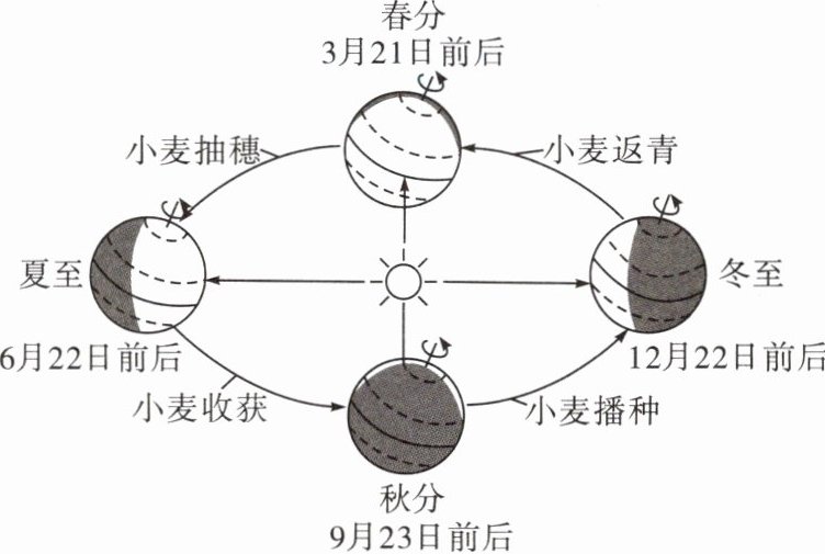 (地理实践·研学)济南的小亮同学在地理社团校园劳动札记中写道:“冬小麦在秋分之后就播种了。不久之后,绿油油的麦苗铺满了麦田,冬天的几场大雪,深深地滋润着小麦,第二年春分之前,随着气温回升,小麦开始返青。在老师的指导下,经过几次浇水,小麦长势喜人。五一前后,小麦开始抽穗。6 月初,收获了沉甸甸的麦穗。”下图是小亮同学在地球公转示意图中标注的小麦生长阶段与相应位置。据此完成 3~4 题。