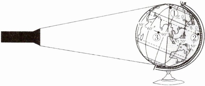 (2)上图中①②黑暗、③明亮;三个点中②地最靠东,时间最早。拨动地球仪,三个点亮的时间不同,每个点都会出现由亮到暗的交替现象。