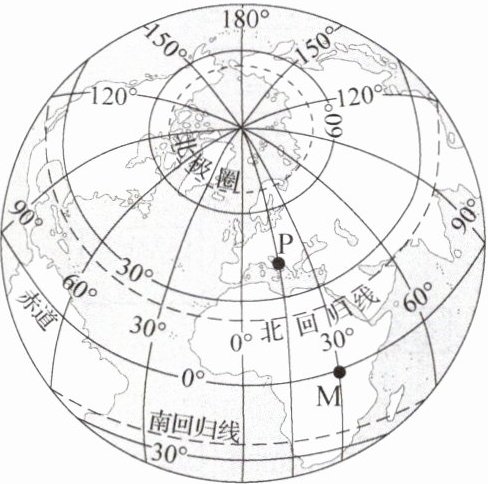 1.D 2.D 解析 第1题,读图可知,意大利某城市(P点)经度为15°E。第2题,P点的纬度约为45°N,位于北温带,无阳光垂直照射。0°—30°为低纬度地区,30°—60°为中纬度地区,60°—90°为高纬度地区;P点的纬度约为45°N,位于中纬度地区。读图可知,M点大致位于(0°,30°E)。根据地球自西向东旋转,M点日出时间早于P点。