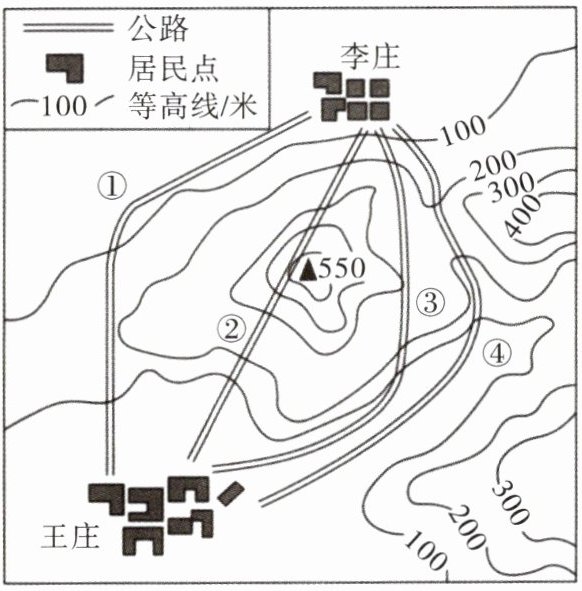 4. 从王庄到李庄,若沿②公路做地形剖面图,其地势变化是( )