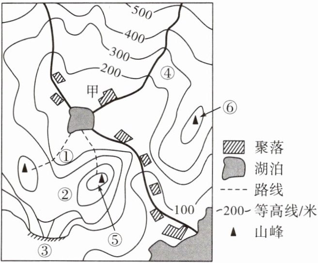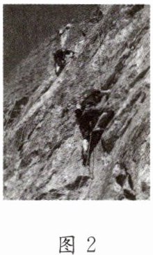 (地理实践·登山活动)下面图1是某地等高线示意图,图2是几名登山队员的登山照片。读图,完成1~2题。