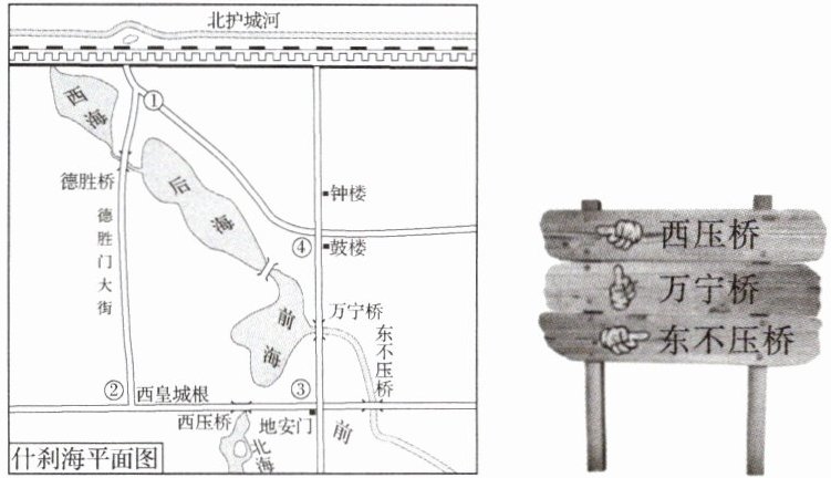 同学们计划去什刹海(北京市)开展地理实践活动,下图为小明绘制的什刹海平面图。读图,完成下列各题。
