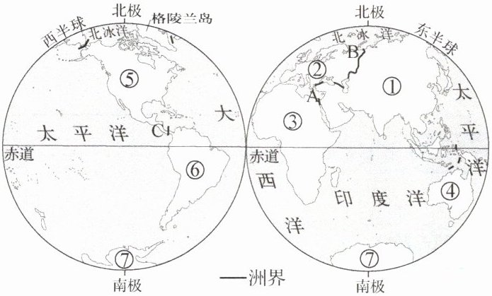 (2)主要分布在西半球的大洲:⑤______、⑥______。C______运河是北美洲与南美洲的分界线。