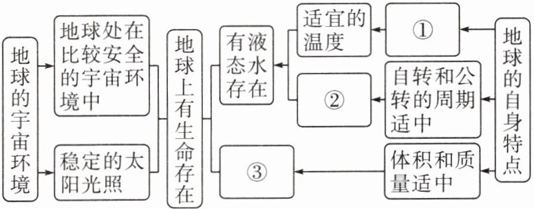 (4)与其他行星相比,地球是一颗特殊的行星。其特殊性表现在它是一颗存在生命的行星。按照相互关系,将下列字母填在对应的横线上,完成示意图。