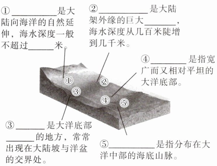 - ①______是大陆向海洋的自然延伸,海水深度一般不超过______米。
