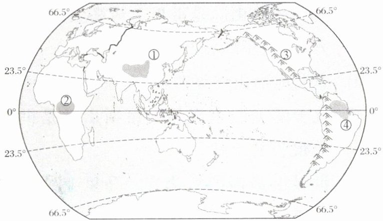 A 解析 读图可知,①是世界上海拔最高的大高原——青藏高原,位于亚洲。