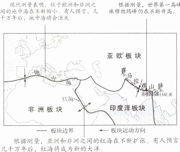 地中海缩小是欧亚板块与非洲板块碰撞挤压,红海扩张是非洲板块与印度洋板块张裂拉伸,珠穆朗玛峰升高是欧亚板块与印度洋板块碰撞挤压。
