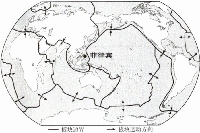 (新素材·时事热点)2024年8月3日6时23分,菲律宾棉兰老岛附近海域发生6.8级地震。下图为世界六大板块分布示意图。读图,完成1~2题。