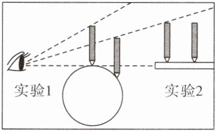 (1)实验1:铅笔在篮球上由近到远移动时,发现______(填“铅笔尖”或“铅笔尾”)会慢慢看不见,铅笔的长度会慢慢变______(填“长”或“短”)。