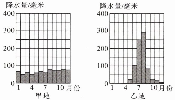 (2)季节变化:降水的季节变化比较小的是____地,降水的季节变化比较大的是____地。