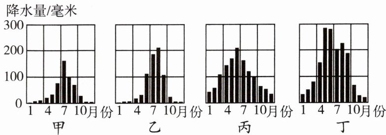 2. C 3. A 解析 第2题,北半球的6、7、8月是夏季,12、1、2月是冬季,读图可知,四个城市降水的共同点是集中在夏季。第3题,读降水量柱状图可知,图中雨季最长,年降水量最多的城市是丁;年降水量最少,雨季最短的城市是甲。4. B 解析 回归线大陆西岸降水较少,赤道附近、中纬度沿海地区和回归线大陆东岸地区降水较多。