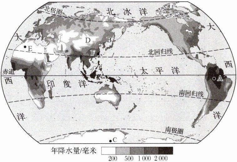 (1)图中A点的降水量在____毫米以上,F点的降水量为1000—2000毫米,C点的降水量在____毫米以下。